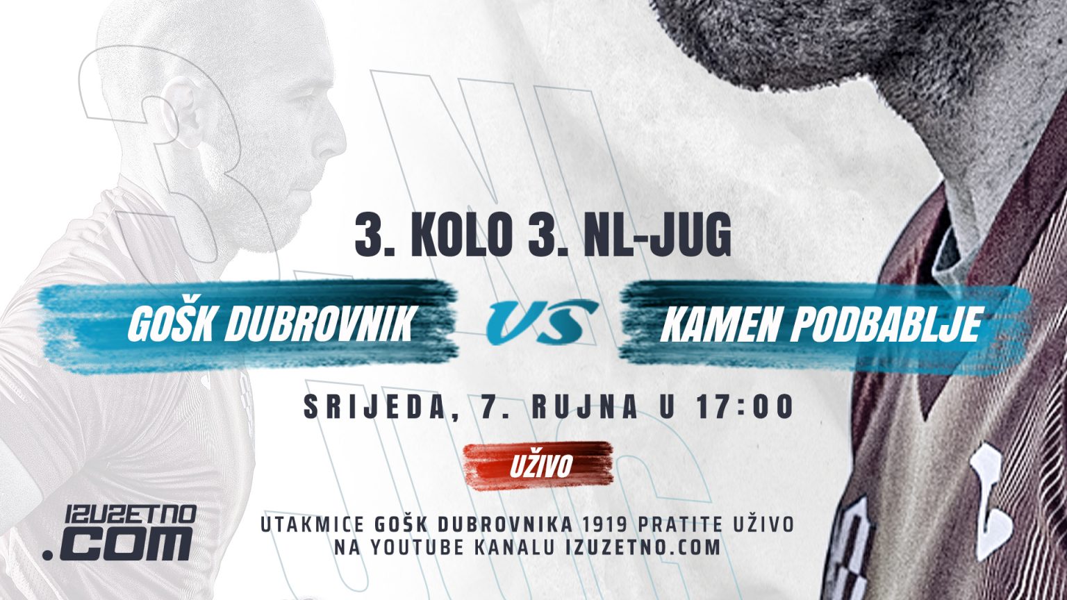 Na youtube kanalu portala Izuzetno.com danas od 17 sati možete pratiti prijenos uživo utakmice 3. kola 3. NL jug između GOŠK Dubrovnika 1919 i Kamena Podbablje. Dubrovačka ekipa koja je u ovu sezonu ušla pomlađena s novim trenerom Vedranom Madžarom, trenutno je 12. na ljestvici dok se Kamen nalazi na 8. mjestu.